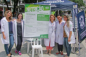 Estagiárias do Ambulatório de Nutrição da UNISANTOS, as alunas estiveram acompanhadas da coordenadora do serviço, a professora doutora Renata Doratioto Albano. Com cartazes e folders, elas apresentavam a pirâmide alimentar, com a dicas dos alimentos essenciais para a saúde, e o novo guia alimentar para a população brasileira, que apresentava a classificação dos alimentos e os dez passos para uma alimentação saudável.