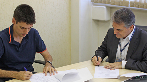 Acompanhado pelos professores mestres Eduardo Rubi Cavalcanti e Lidiane do Nascimento Diniz Fernandes Santos de Souza, que ministram as disciplinas, o reitor da UNISANTOS, professor mestre Marcos Medina Leite, recebeu o editor-chefe do G1 e do GloboEsporte.com Santos e Região, o jornalista Alexandre Lopes, no Campus Dom Idílio José Soares, para a assinatura do convênio que formaliza o projeto ‘Foca na Pauta’.