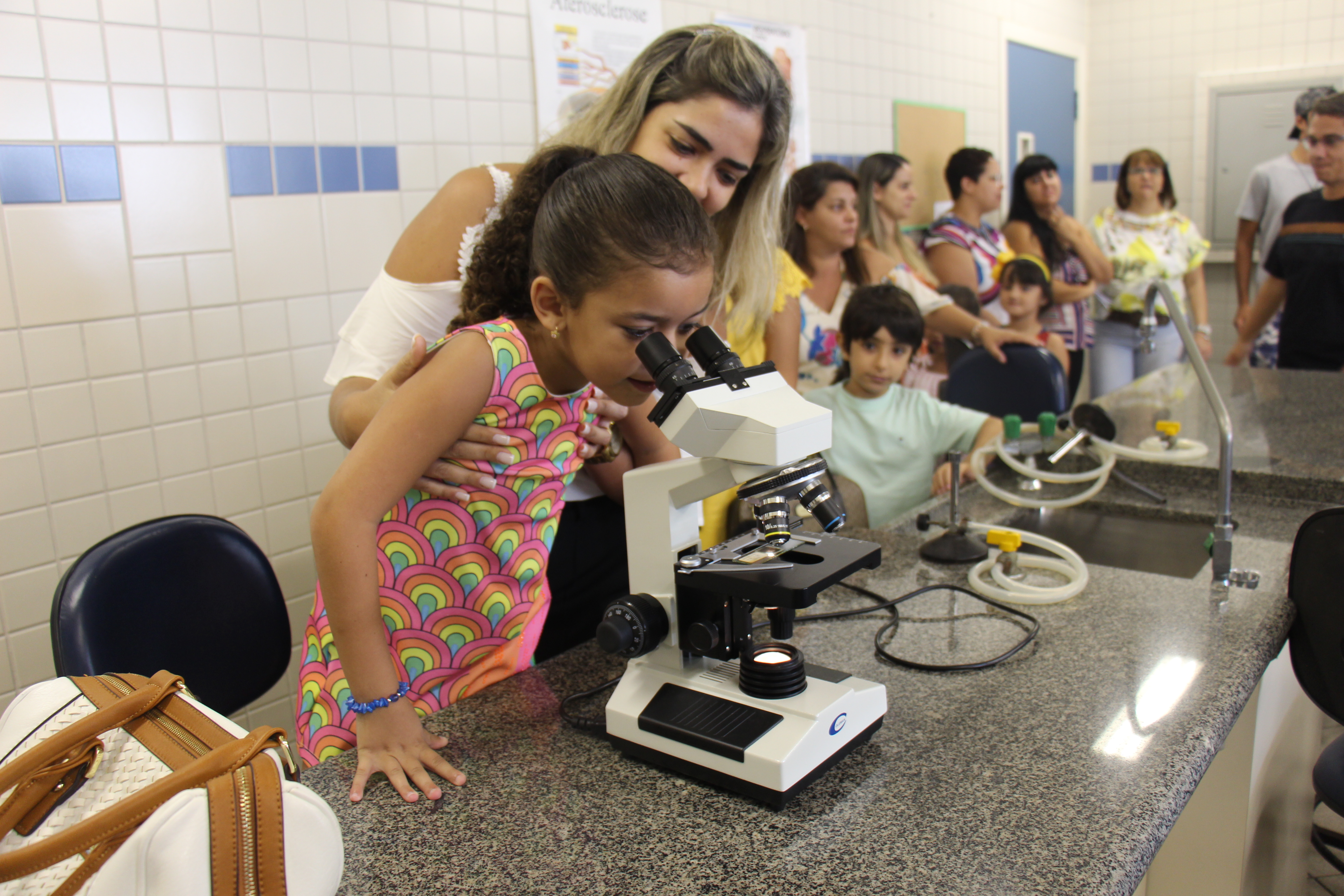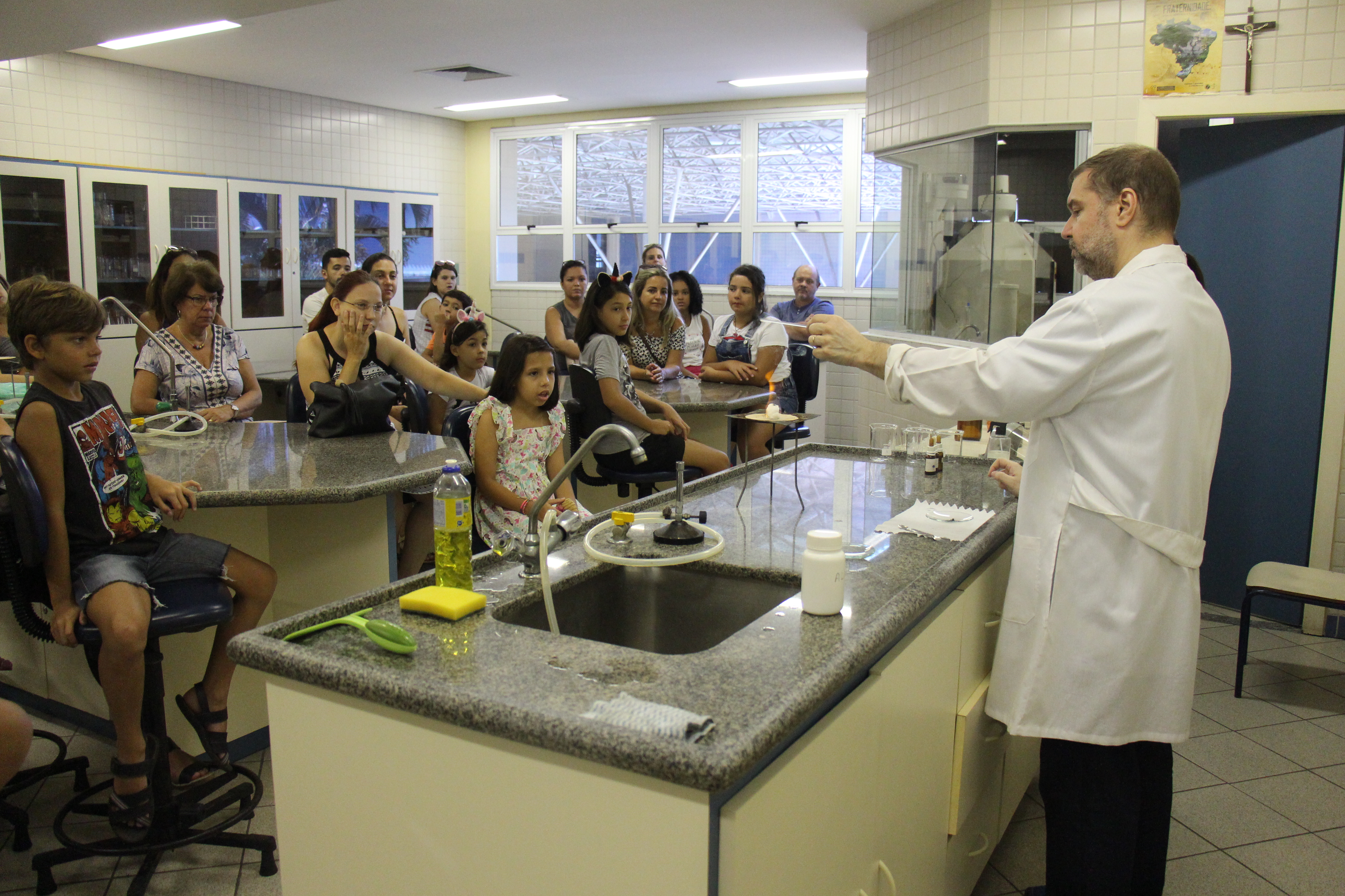 Estudantes dos Ensinos Fundamental e Médio visitaram os laboratórios de Química (com os professores Flávio Roca e Sonia Brito), Física (com a professora Marta Taliani) e de Biologia (com as professoras ISabela Dias e Valdilene Carvalho). Em cada um dos espaços, assistiram a demonstrações de experimentos e participaram de observações nos microscópios.
