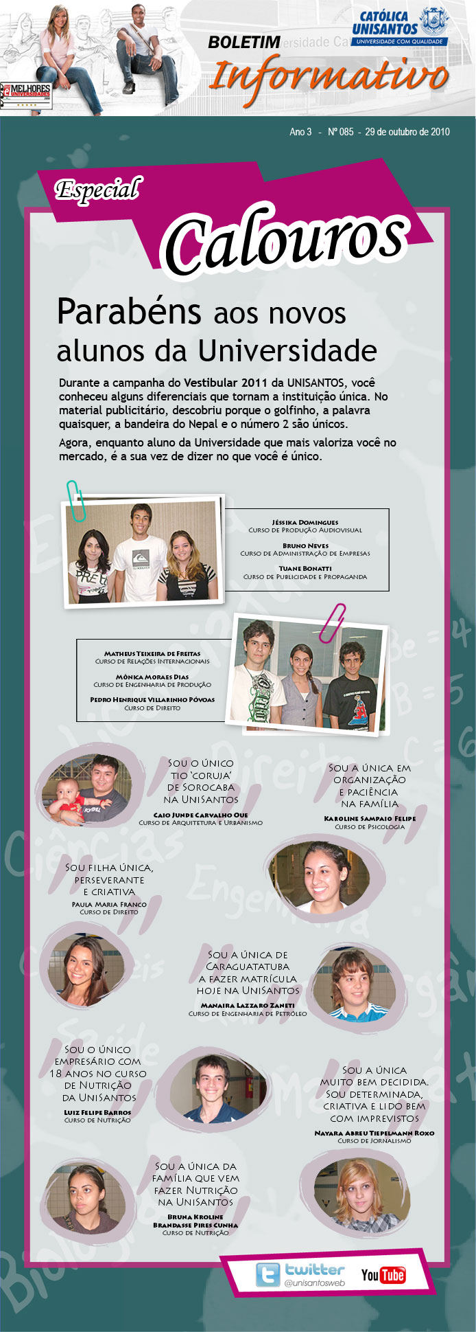 Entre em contato com sugestões e opiniões, ou caso queira deixar de receber nosso Boletim. Assessoria de Imprensa da Universidade Católica de Santos. imprensa@unisantos.br