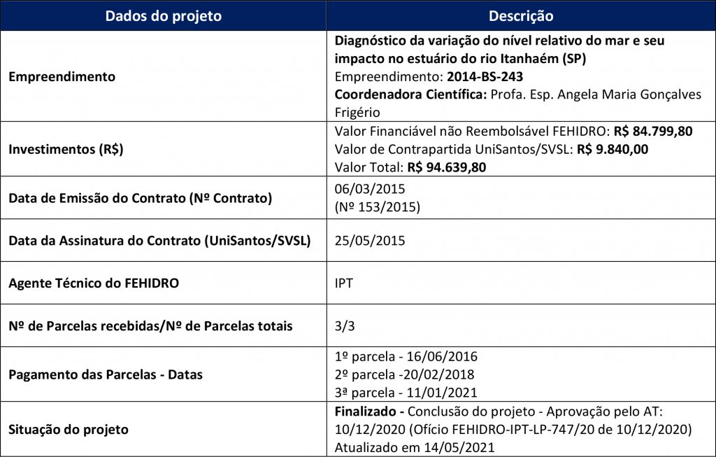 A Região Metropolitana da Baixada Santista (SP) – RMBS, na qual se insere o Município da Estância Balnearia de Itanhaém, é identificada conceitualmente como área crítica em cenário proposto pela OECD quanto a eventos climáticos extremos, com a inundação de terras úmidas, impactos para a biota e urbanizações em baixa cota, bem como na navegação. Assim, fornecer os prováveis cenários de inundação nas áreas urbanas e nos bosques de mangues do Estuário de Itanhaém, além dos impactos sobre a biota da região e o meio físico, afetando as condições das drenagens continentais; bem como aumentar a conscientização da importância do conhecimento sobre os impactos dos eventos extremos nas áreas estuarinas, o que envolve a variação do nível relativo do mar tem grande relevância.