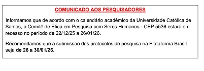 O Comitê de Ética em Pesquisa com Seres Humanos da Universidade Católica de Santos, identificado pela sigla CEP, é um órgão colegiado, multidisciplinar, de caráter público e autônomo, vinculado ao Gabinete do Reitor, constituído nos termos das resoluções nº. 466/12 e 510/16, do Conselho Nacional de Saúde. Ele tem por finalidade avaliar e acompanhar os aspectos éticos de pesquisas envolvendo seres humanos e, dessa forma, proteger a integridade e a dignidade dos sujeitos/participantes, de acordo com os valores ético-cristãos, integrando-se à missão institucional da Universidade.