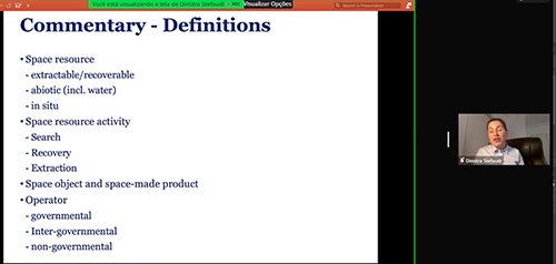 Doutoranda em Direito Espacial pela Universidade de Leiden, da Holanda, Dimitra Stefoudi foi a responsável por apresentar a temática sobre o desenvolvimento de uma estrutura internacional sobre governança de recursos espaciais. A pesquisadora comentou sobre os tipos de recursos espaciais que existem e dos Direitos prioritários nessas áreas de recursos. Ela ainda ressaltou que a educação pode contribuir muito com essa área, além da tecnologia e a ciência espacial que estão em franco desenvolvimento.