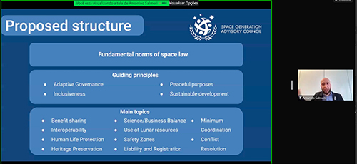 Da Universidade de Luxemburgo, o doutorando em Direito Espacial, Antonino Salmeri, apresentou a palestra “The Lunar Governance Report of the Space Generation Advisory Council”. Ele explicou mais sobre o grupo de estudos dessa temática desde a sua composição até pesquisas elaboradas. O palestrante também fez questão de declarar que o dialogo global com os públicos gerais tem uma grande importância nessa temática. “O melhor caminho para seguir esse assunto é o compartilhamento de maneiras e a resolução de pontos que convergem nessa questão”, disse.