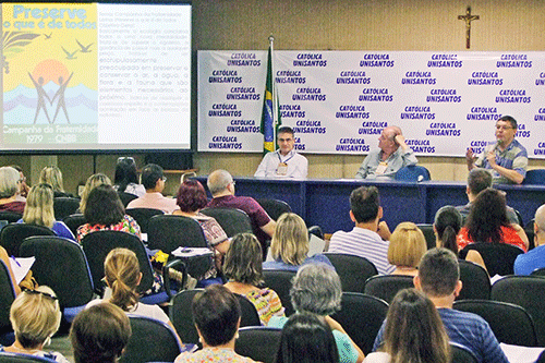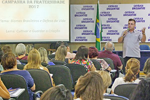 Inspirados na relação do Homem com a natureza, mais de 80 professores das escolas católicas da Região Metropolitana da Baixada Santista reuniram-se na Universidade Católica de Santos, no último dia 4, durante o Encontro de Formação da Campanha da Fraternidade – CF 2017.  O grupo, que compõe a ANEC (Associação Nacional de Educação Católica do Brasil) da Baixada Santista, discutiu e apresentou projetos integradores, como estratégia pedagógica para trabalhar o tema da CF (“Fraternidade: biomas brasileiros e defesa da vida”), com foco na Mata Atlântica, a partir de temáticas como Resíduos Sólidos, Ocupação, Clima e Água.