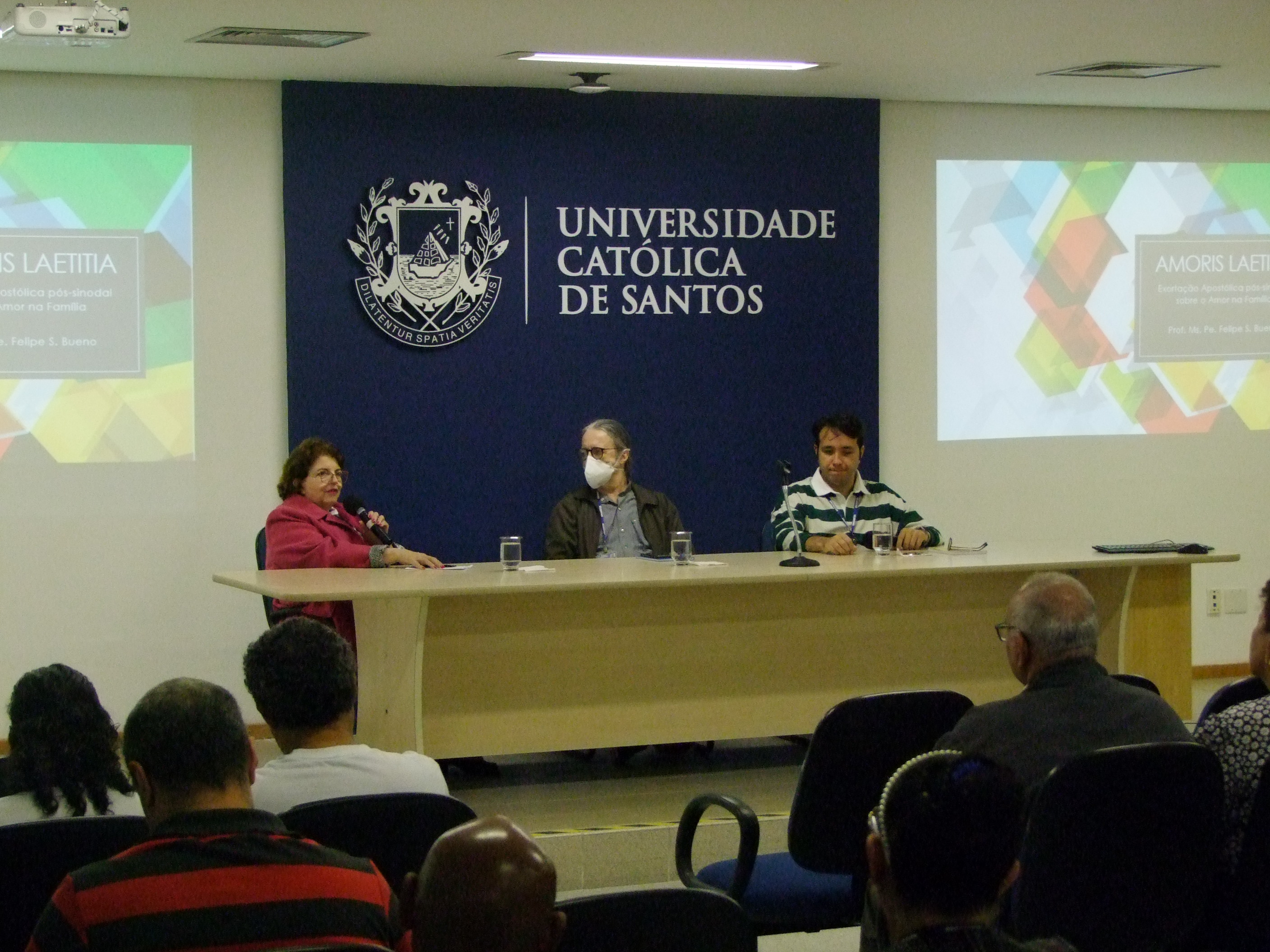 Participaram da mesa, a coordenadora do curso de Psicologia da UNISANTOS, a professora mestre Iara Cândida Chalela Genovese, e o docente do curso de Teologia para Leigos, mestre padre Felipe Sardinha Bueno. A mediação foi realizada pelo coordenador do curso, o professor mestre Francisco Emílio Surian.
