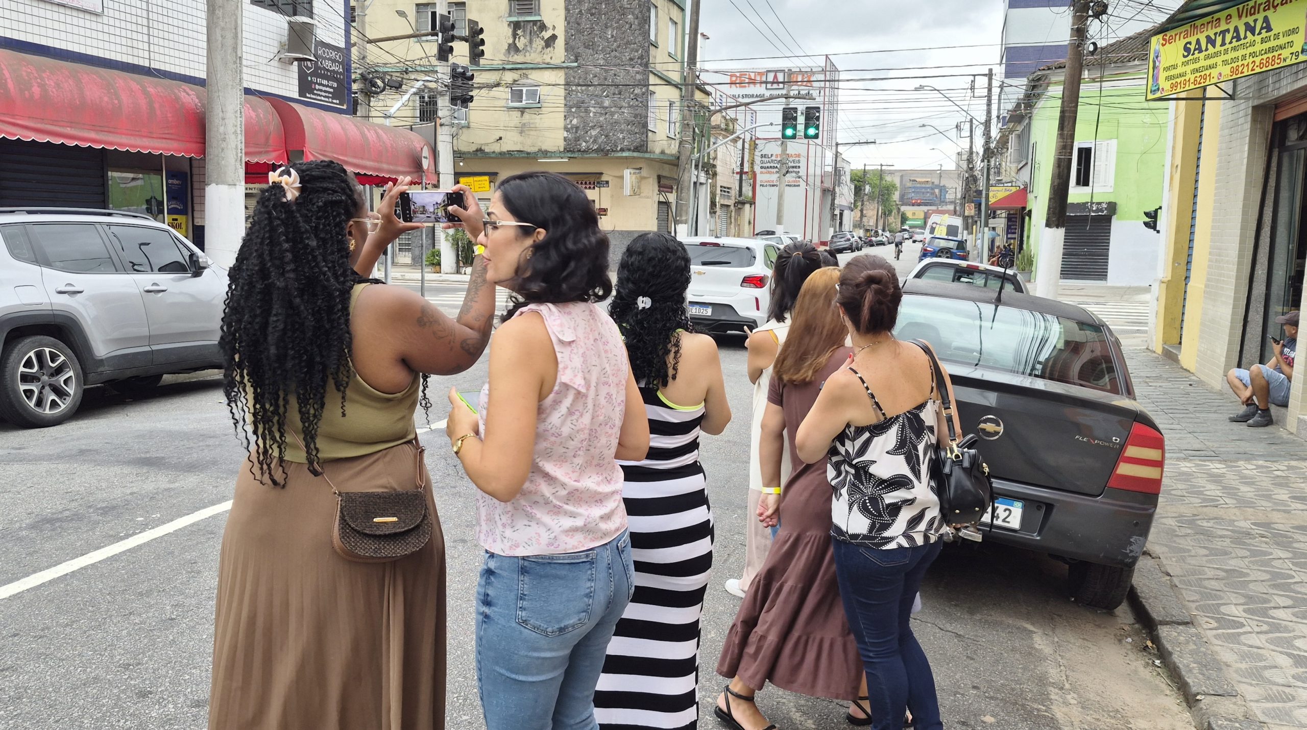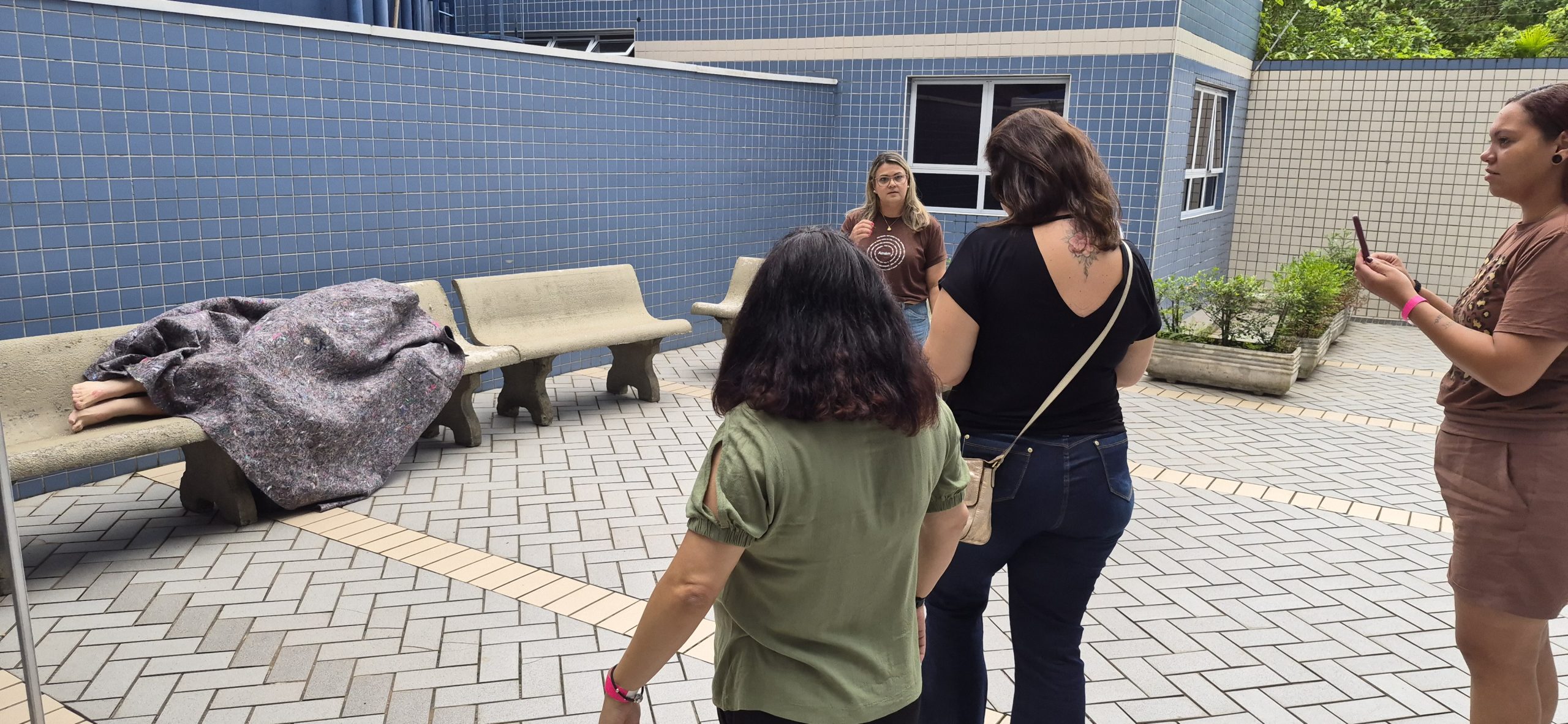 Do Colégio Stella Maris, Daniela Mateus da Costa disse que o encontro de 2026 foi mais dinâmico, produtivo. “Sempre gostei de fotografia e na escola a gente faz muito registro”, contou a docente que decidiu se posicionar no canteiro central da Avenida Conselheiro Nébias , em frente à Universidade, para fotografar uma pessoa em situação de rua deitada nos bancos de um abrigo de ônibus, ao lado de uma pessoa sentada e indiferente à realidade.