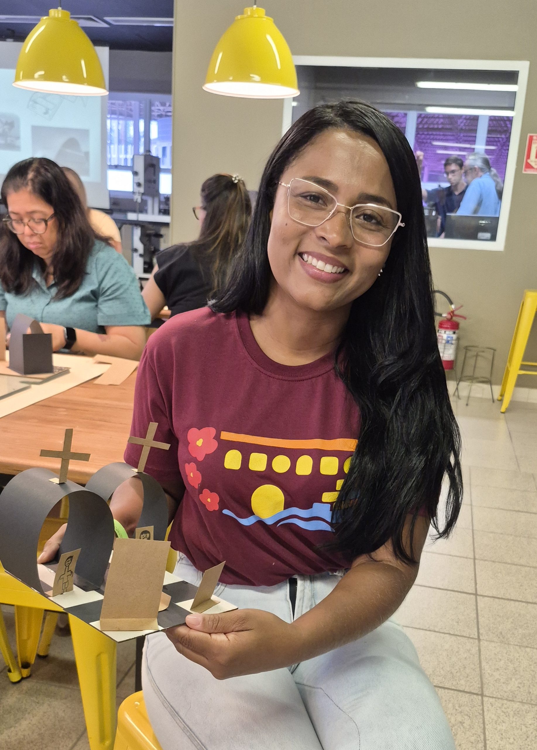 REALIDADE – Professora de Educação Infantil do Marista Escola Social Lar Feliz, Bianca dos Santos Alves participou da oficina de Maquetes que teve o objetivo de buscar um olhar sobre a região, na perspectiva do tema da CF 2026, a partir da criação de miniaturas usando papel holler, papel color plus preto e papel kraft.