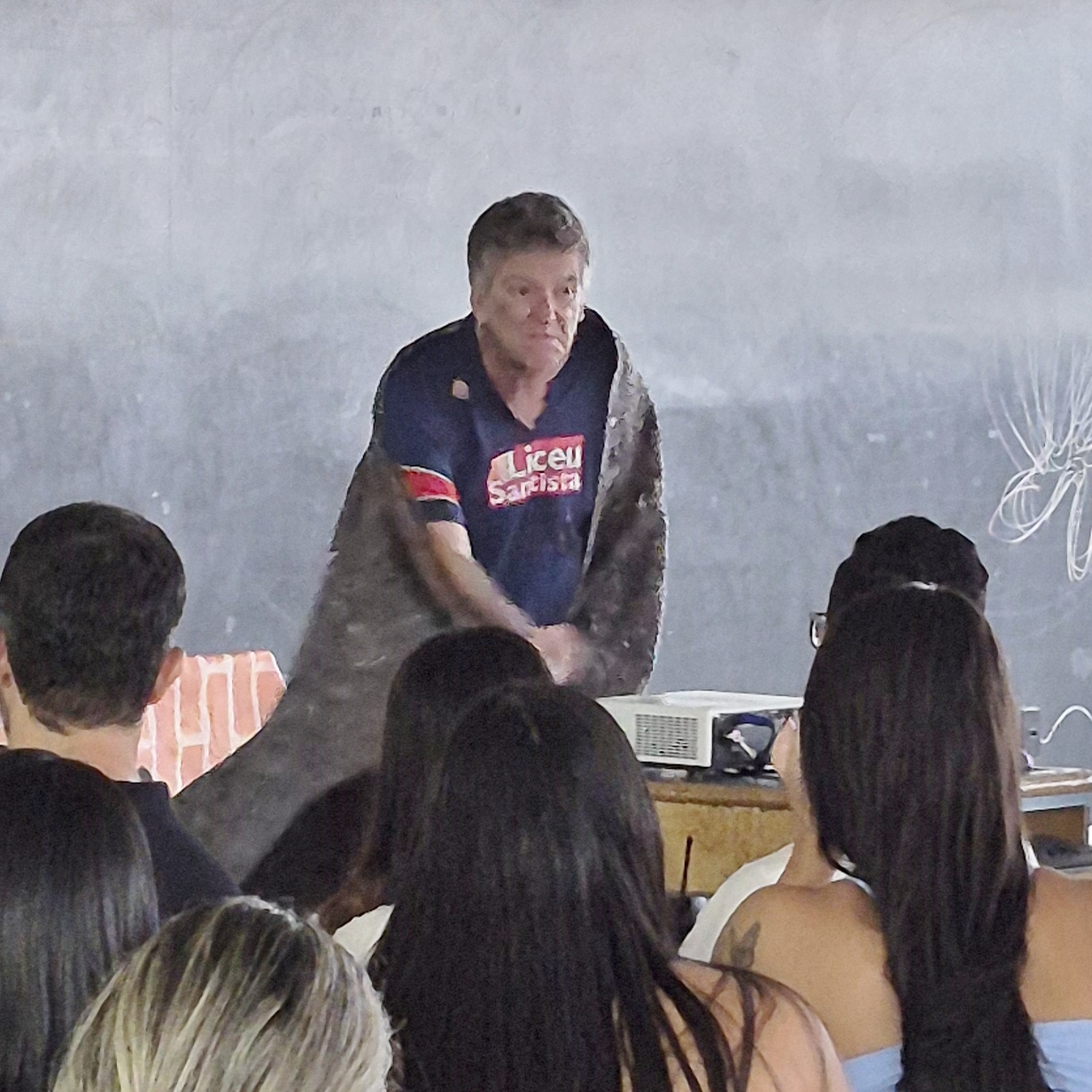 Vice-diretor do Liceu Santista, o professor doutor Sérgio Nogueira Júnior fez uma performance, representando a imagem do cartaz da CF2026. Ele representou a escultura “Cristo sem teto”, criada pelo artista católico canadense, Timothy Schmalz, após observar um homem em situação de rua dormindo em um banco de parque, em Toronto.