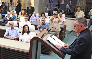 “Desejo ser um bom cidadão santista”. Com essa frase o chanceler da UNISANTOS e presidente da Sociedade Visconde de São Leopoldo (SVSL), o bispo diocesano de Santos, Dom Tarcísio Scaramussa, encerrou seu discurso de agradecimento após receber o Título de Cidadão Emérito de Santos. A outorga ocorreu, na última terça-feira (14), em sessão solene no Plenário Dr. Oswaldo Carvalho de Rosis, na Câmara Municipal de Santos.