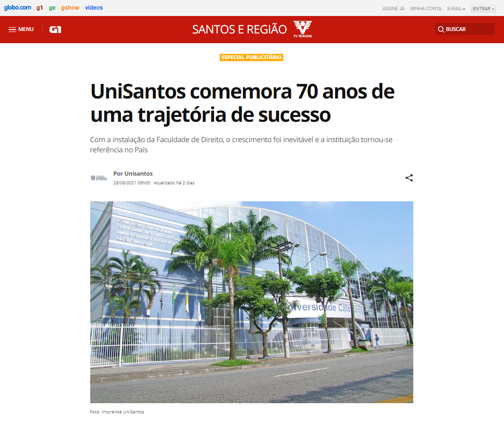 A matéria publicada pelo G1 Santos sobre os 70 anos de início da história da UNISANTOS apresenta um contexto histórico e relata fatos marcantes, além de tratar de aspectos sobre o ensino, a pesquisa e a extensão. Os investimentos em pesquisa e a presença marcante na sociedade também contribuem para a compreensão da identidade católica e comunitária da instituição.