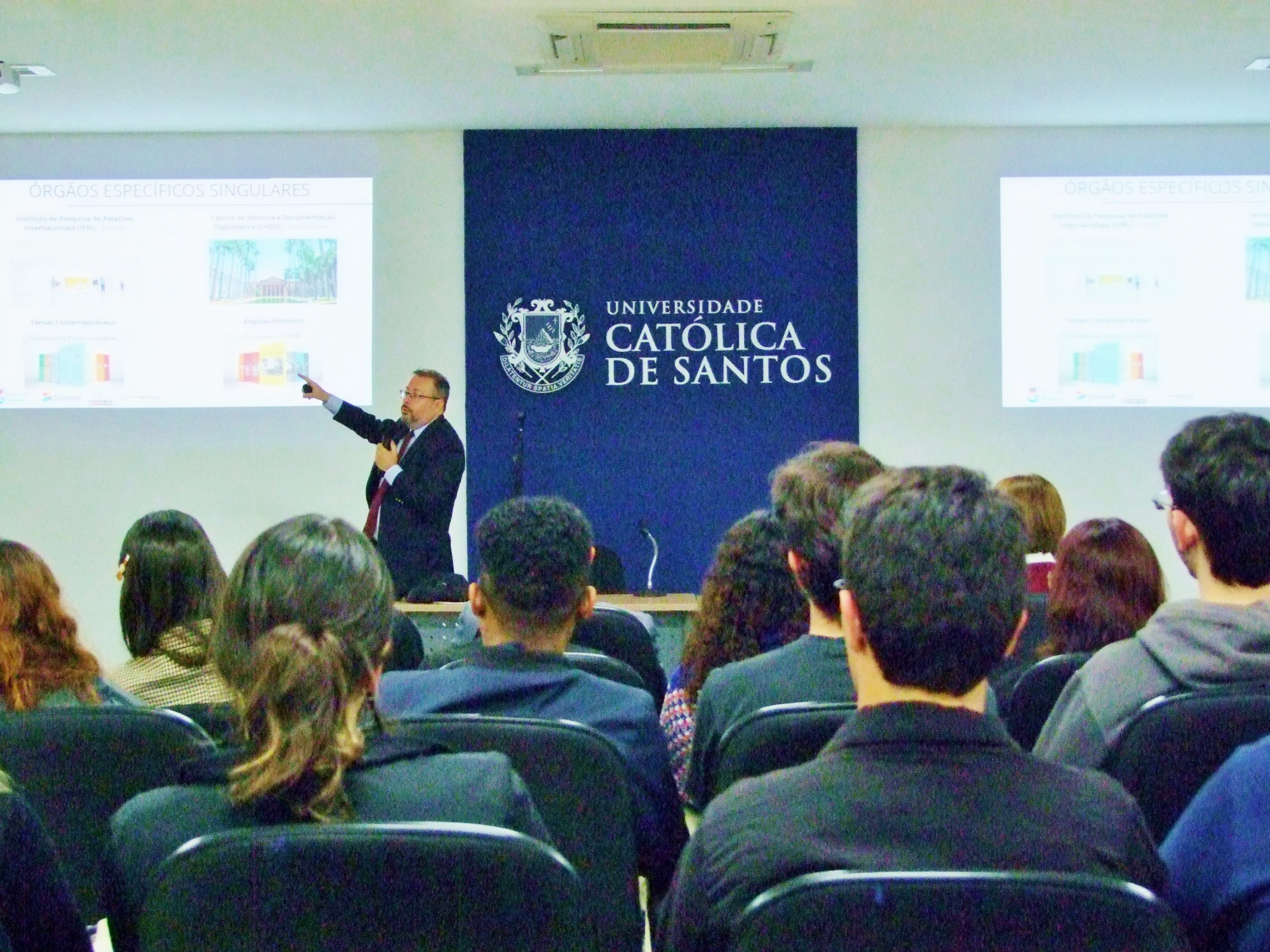 Diretor do Instituto de Pesquisa de Relações Internacionais (IPRI), órgão da Fundação Alexandre de Gusmão, vinculado ao Ministério das Relações Exteriores, o ministro Almir Lima Nascimento esteve na UNISANTOS, na terça-feira (26). A visita incluiu reunião com pesquisadores da instituição e palestra voltada para os estudantes do curso de Relações Internacionais.