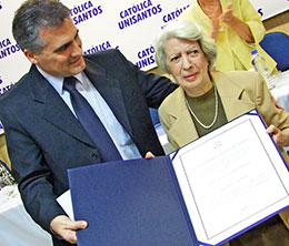 “Que esta data se repita, mantendo a seriedade e o amor pela ciência histórica”, disse a professora doutora Wilma Therezinha Fernandes de Andrade, durante a entrega da comenda do Mérito Acadêmico. Mestre e doutora em História Social, ela criou o Centro de Documentação da Baixada Santista, atual Núcleo de Pesquisa em História da UNISANTOS. É autora de diversas obras, entre elas “Santos: Um Encontro com a História e a Geografia”, que tem selo da Editora Leopoldianum. Criou, há mais de 50 anos, o Roteiro Histórico pelo Centro de Santos. Ao ser questionada sobre a sua contribuição na trajetória do curso, de forma espontânea, respondeu: “Temos muitos projetos pela frente. Tenho muitas ideias ainda”, revelando que está finalizando um livro paradidático e outros reunindo os seus principais trabalhos. Ela foi homenageada pelo coordenador do curso de História, professor mestre Paulo Fernando Campbell Franco, que fez a sua apresentação.