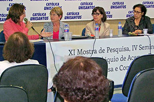 Ainda como parte da programação do evento, foi realizada a mesa-redonda “Relação universidade-escola”, organizada pelo Programa de Mestrado e Doutorado em Educação e que integrou a IX Mostra de Pesquisa, IV Seminário Parfor e IX Colóquio de Acervos Escolares: Pesquisa e Compromisso Social. Com a discussão focada no estágio escolar, na práxis docente e políticas educacionais, participaram as professoras doutoras Selma Garrido Pimenta, Marineide de Oliveira Gomes e a professora mestre Simone Nogueira, sob a coordenação da professora doutora Maria Amélia do Rosário Santoro Franco.