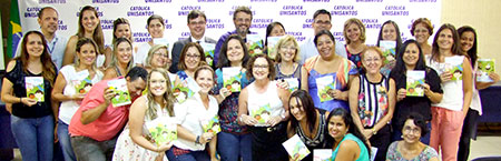 Agentes de Saúde e organizadores exibem a cartilha durante o encerramento do curso