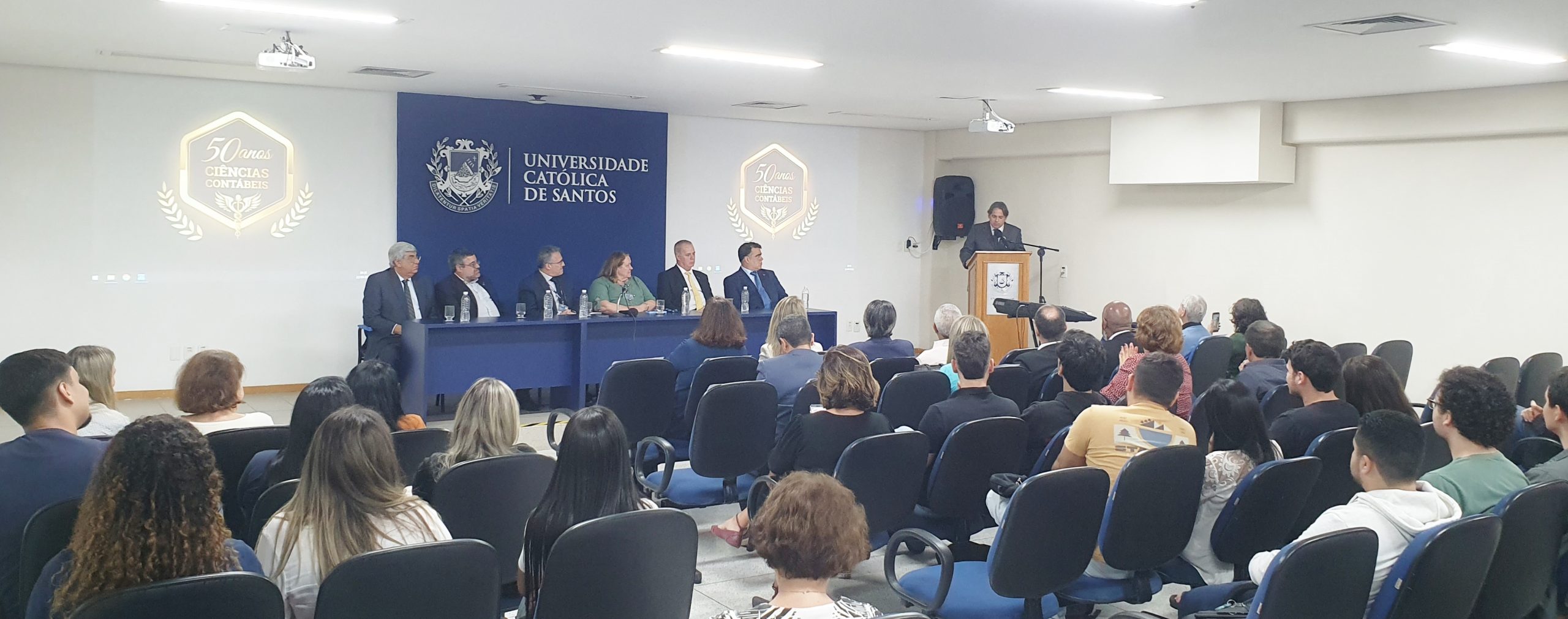 Participaram da mesa, o reitor, professor mestre Marcos Medina Leite; a diretora do Centro de Ciências Sociais Aplicadas e Saúde, Flávia Henriques; o coordenador do curso de Ciências Contábeis, o professor mestre Antonio Alvarez Monteiro; o vereador de Santos, Cacá Teixeira (PSDB); o auditor fiscal da Receita Federal em Santos, Renato César Leite; e o representante do Conselho Regional de Contabilidade do Estado de São Paulo em Santos, Luciano da Silva Oliveira.