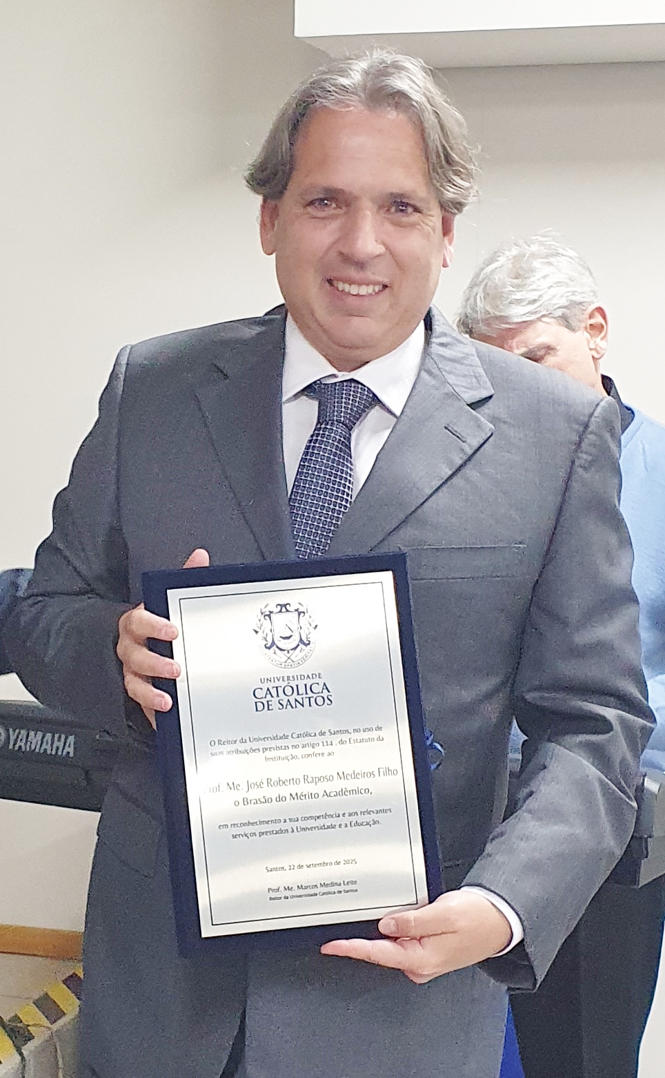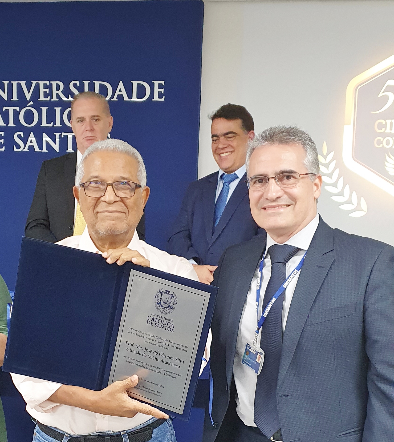 Para comemorar os 50 anos de criação do curso de Ciências Contábeis, a UNISANTOS homenageou, no último dia 22, os professores José de Oliveira Silva e José Roberto Raposo Medeiros Filho, com a entrega do “Brasão do Mérito Acadêmico”. O evento, que reuniu autoridades da área, docentes, discentes e egressos, foi marcado pela emoção e lembranças da trajetória profissional dos laureados.
