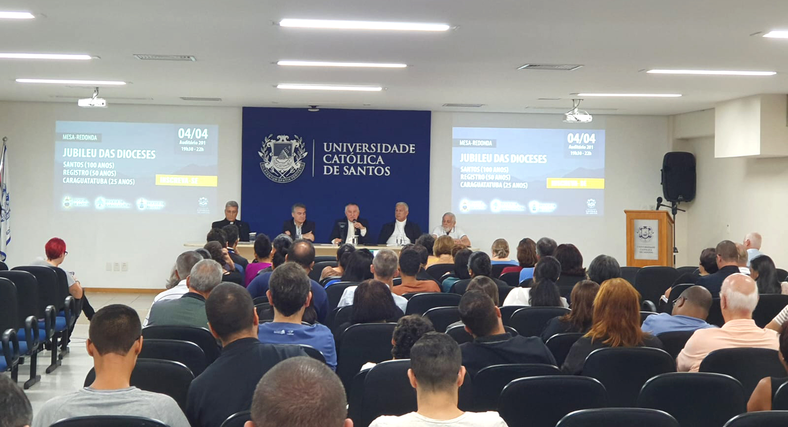 Compartilhar com a comunidade acadêmica a presença da Igreja na sociedade, a sua história e os desafios frente ao mundo atual foi o objetivo do encontro das dioceses de Santos, Registro e Caraguatatuba, no último dia 4, na UNISANTOS. No ano em que elas comemoram 100, 50 e 25 anos, respectivamente, os sentimentos de comunhão, alegria e fé foram ressaltados pelos bispos de Santos, Dom Tarcísio Scaramussa, de Registro, Dom Manoel Ferreira dos Santos Júnior, e de Caraguatatuba, Dom José Carlos Chacorowski.
