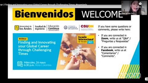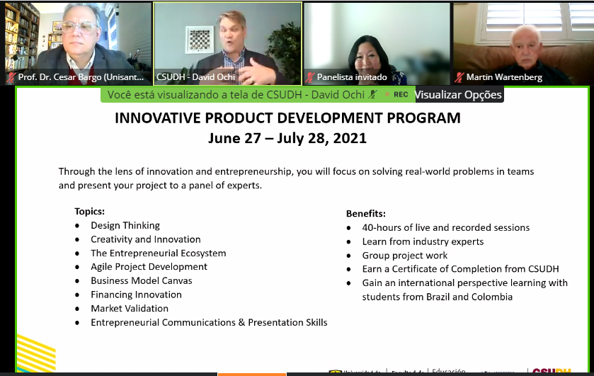 A UNISANTOS e a Universidad de Los Andes, da Colômbia, promoveram, no dia 26 de maio, o webinar “Innovating your Global Career”, com o objetivo de discutir questões relacionadas à inovação profissional na atualidade e promover o Programa de Desenvolvimento de Produtos Inovadores, nos dias 27 e 28 de junho, que será pela California State University, Dominguez Hills (CSUDH), com apoio das instituições. O evento contou com a participação do diretor executivo da Entrepreneur Center, da UC Irvine, David Ochi, e do docente da mesma instituição, o engenheiro Martin Wartenberg. A mediação foi do coordenador da Assessoria de Relações Institucionais da UNISANTOS, o professor doutor Cesar Bargo Perez.