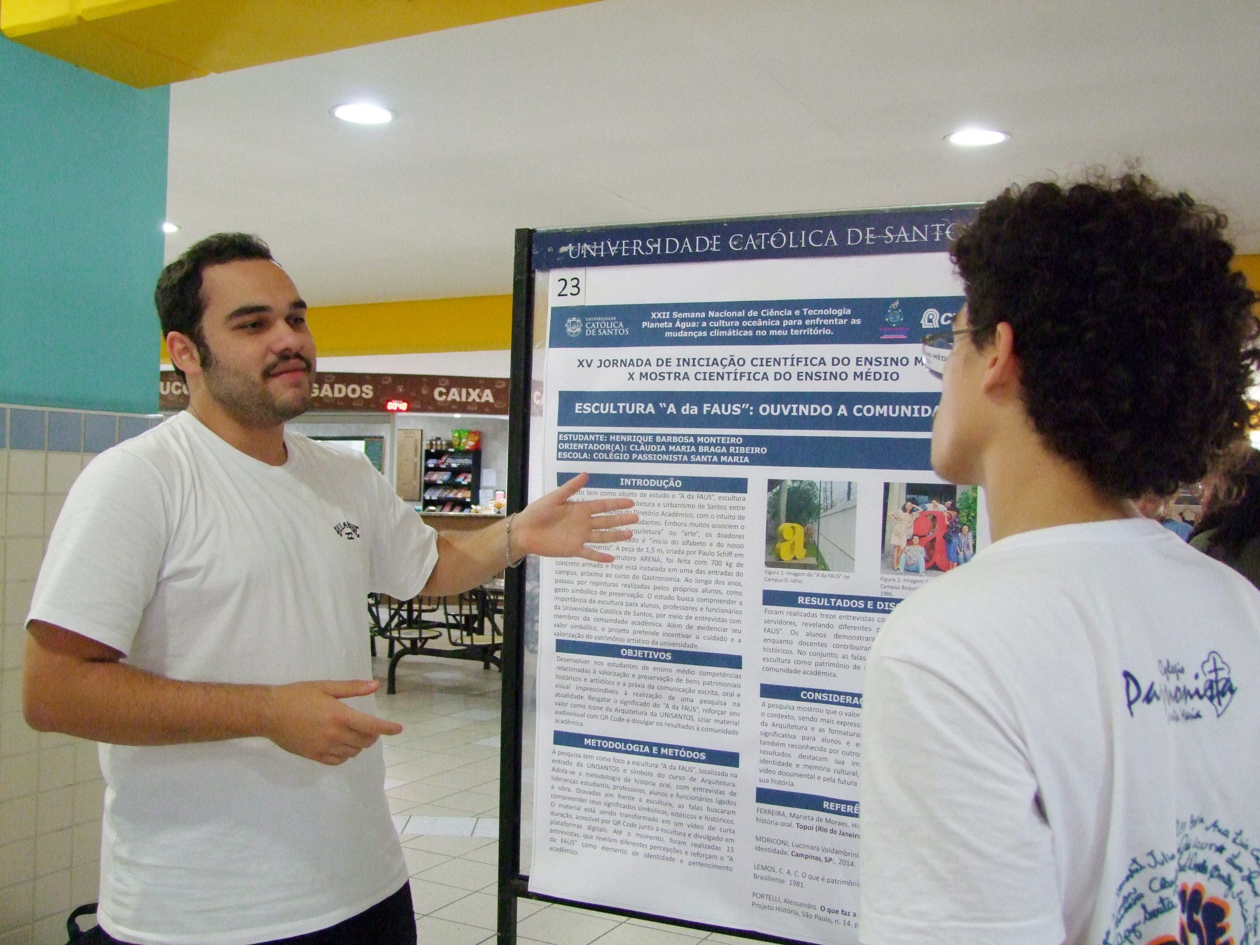 ENSINO MÉDIO – Por meio de pôsteres, os estudantes do ensino médio, das escolas da região conveniadas com a instituição, também puderam apresentar a produção científica desenvolvida ao longo de um ano de trabalho. Os trabalhos foram orientados por professores mestres e doutores da UNISANTOS.