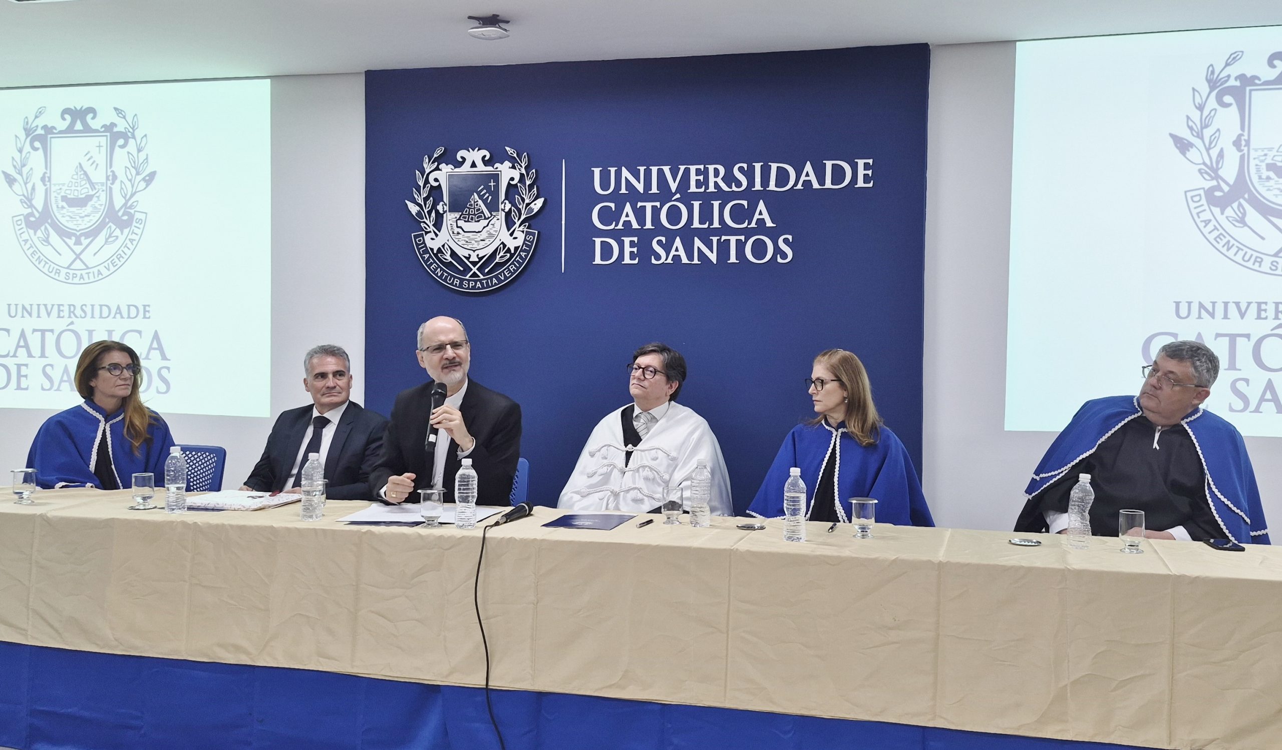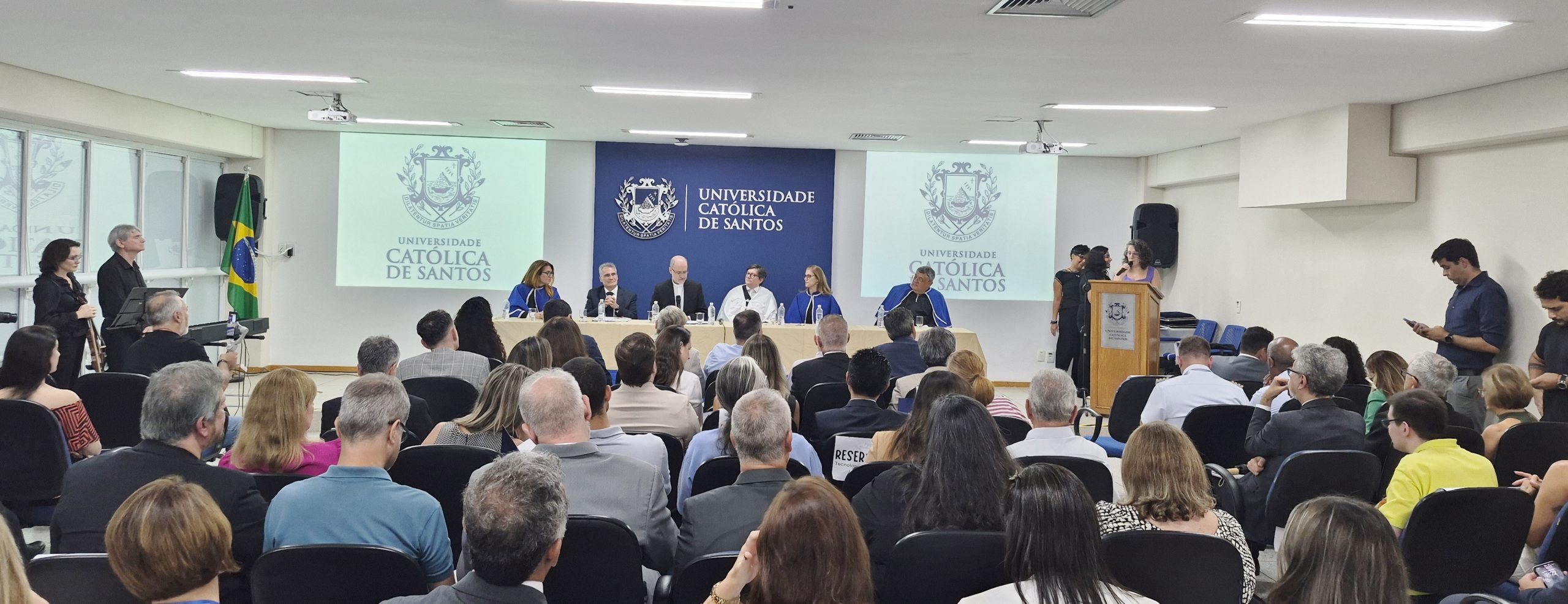 Com a presença marcante da comunidade acadêmica, e de autoridades civis, religiosas e acadêmicas, a solenidade, realizada no auditório e transmitida para outro espaço em razão do número de pessoas, foi marcada pelas mensagens que ressaltaram os valores da instituição, fundamentados na ética cristã, na solidariedade, na justiça, e no respeito aos direitos humanos. A história da UNISANTOS, que neste ano completa 75 anos de existência e 40 anos de reconhecimento, tornando-se a primeira universidade do litoral do Estado de São Paulo, também foi lembrada por meio do seu fundador, o bispo diocesano de Santos, Dom Idílio José Soares (1914-1969), e pelo primeiro reitor, o padre Waldemar Valle Martins (1926-2004).