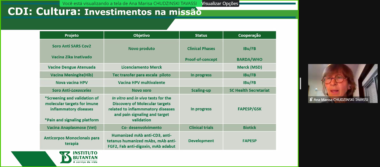 Atuando diretamente em pesquisas, entre elas no desenvolvimento do soro anti-covid, a diretora do Centro de Desenvolvimento e Inovação do Instituto Butantan, a professora doutora Ana Marisa Chudzinski-Tavassi explicou sobre todo o processo de elaboração de produtos que acontecem no Instituto. A pesquisadora destacou que até chegar ao resultado final do produto, ele passa por quatro pilares que são: desenvolvimento de pesquisas básicas, inovações para o desenvolvimento, desenvolvimento cultural e bioindustrial. Segundo ela, todos esses projetos para serem aprovados precisam de soluções inovadoras e um ótimo trabalho em equipe.