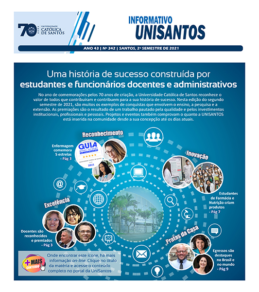 No ano de comemorações pelos 70 anos de criação, a Universidade Católica de Santos reconhece o valor de todos que contribuíram e contribuem para a sua história de sucesso. Nesta edição do segundo semestre de 2021 do Informativo UNISANTOS, são muitos os exemplos de conquistas que envolvem o ensino, a pesquisa e a extensão. As premiações são o resultado de um trabalho pautado pela qualidade e pelos investimentos institucionais, profissionais e pessoais. Projetos e eventos também comprovam o quanto a UNISANTOS está inserida na comunidade desde a sua concepção até os dias atuais.