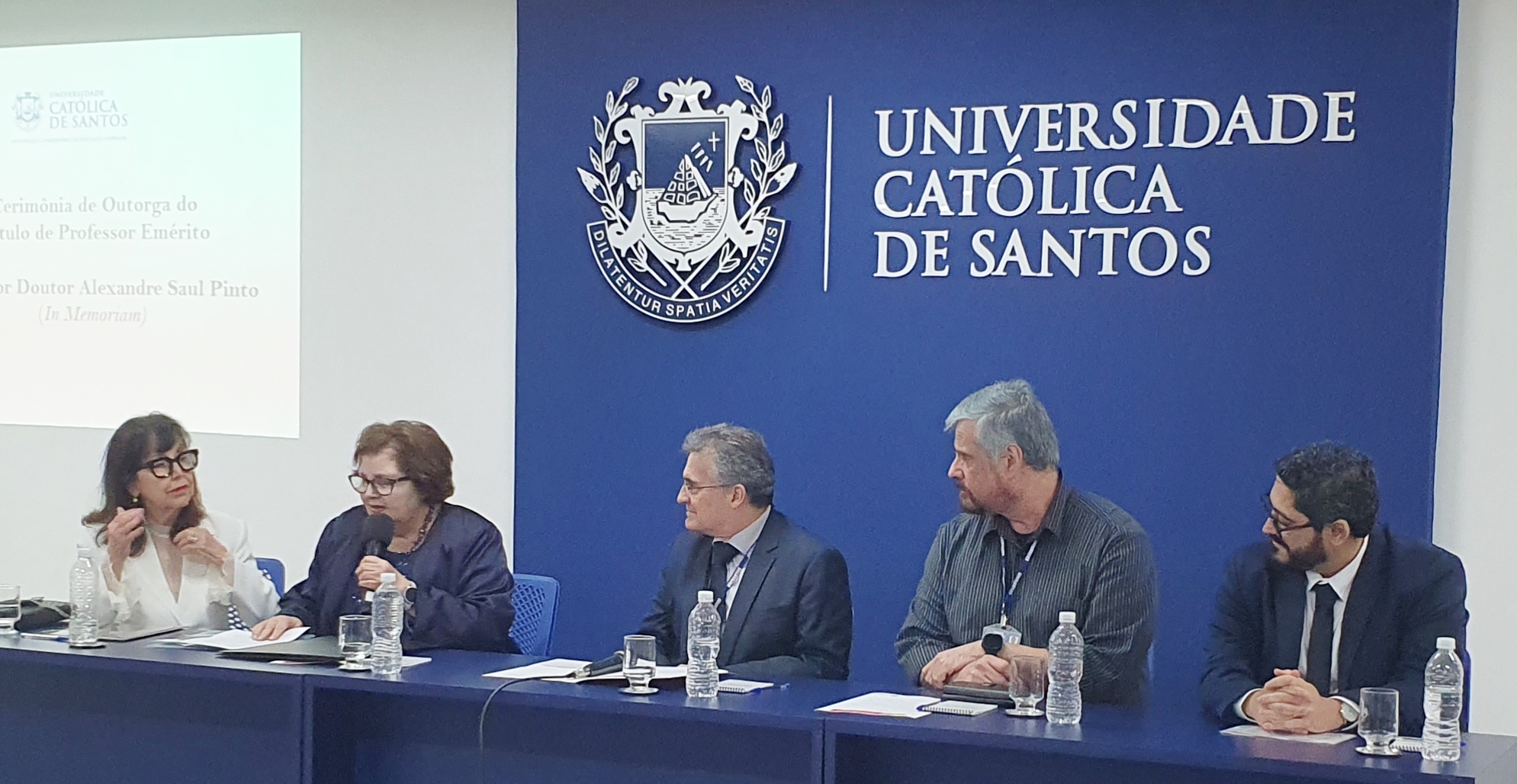 A professora doutora Maria Amélia do Rosário Santoro Franco, que convidou o professor Alexandre Saul para integrar o quadro de docentes e pesquisadores da UNISANTOS, fez a Loa, o discurso de homenagem destacando a sua trajetória e legado. “A sua força permanece entre nós. Ele deixou marcas profundas”, disse. Coordenador do Programa de Pós-Graduação Stricto Sensu em Educação, o professor doutor Roberto Araújo da Silva Vasques Rabelo fez um agradecimento especial por toda a contribuição do educador.