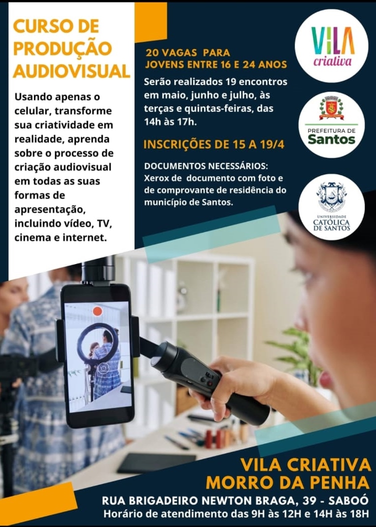 O Centro de Tecnologia e Inovação em Artes, Design e Audiovisual da UNISANTOS promove o curso de Produção Audiovisual na Vila Criativa do Morro da Penha, em Santos. Voltado para jovens entre 16 e 24 anos, busca oferecer qualificação para que os jovens possam ser inseridos no mercado de trabalho da produção audiovisual.